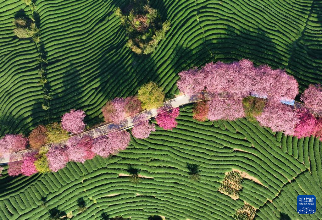 2月17日,位于福建省漳平市永福镇的台品樱花茶园里樱花盛开(无人机照片)。新华社记者 魏培全 摄