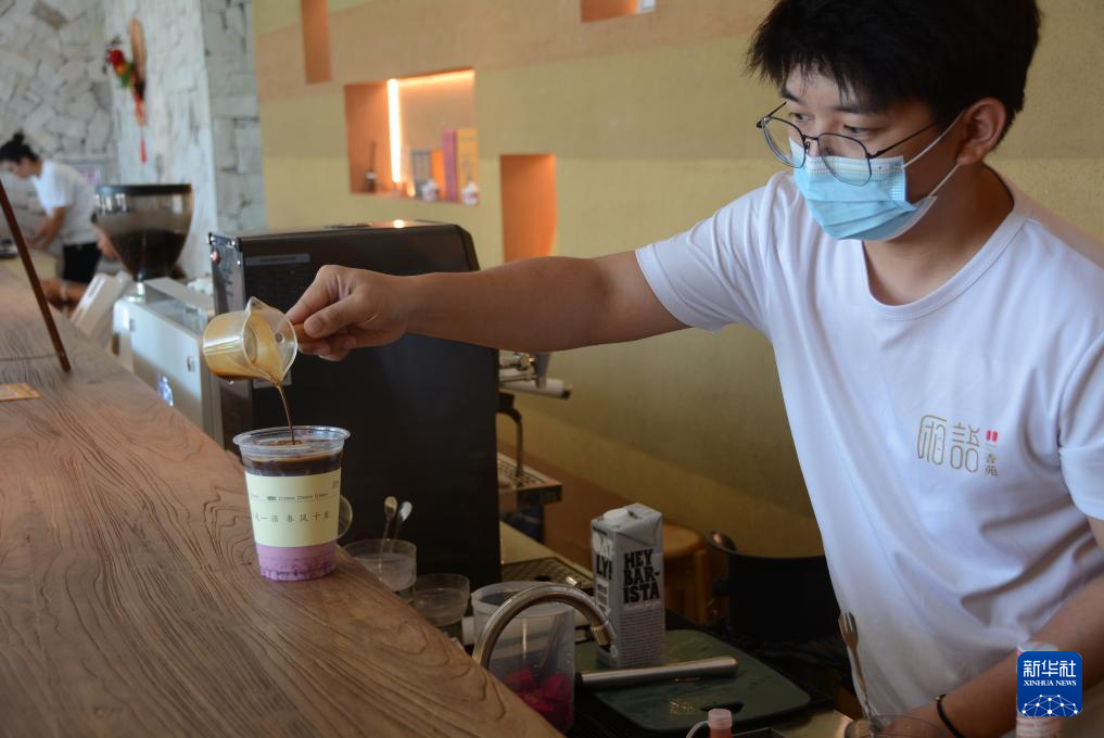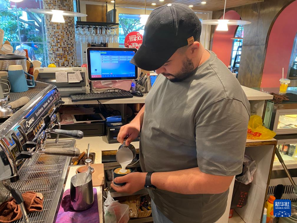 8月2日,费萨尔正在店内制作拉花咖啡。新华社记者 颜之宏 摄