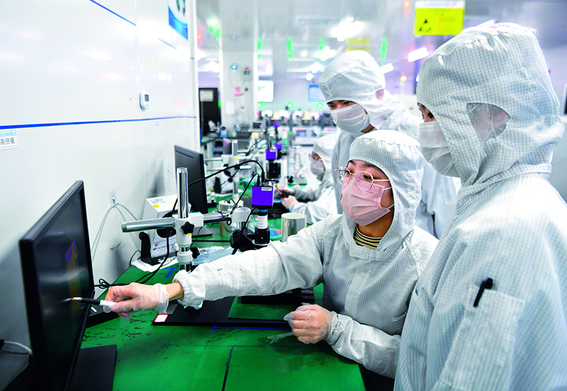 在位于石狮高新区的福建中科光芯光电科技有限公司,技术人员探讨光芯片生产工艺(2023年2月23日摄) 魏培全摄/本刊