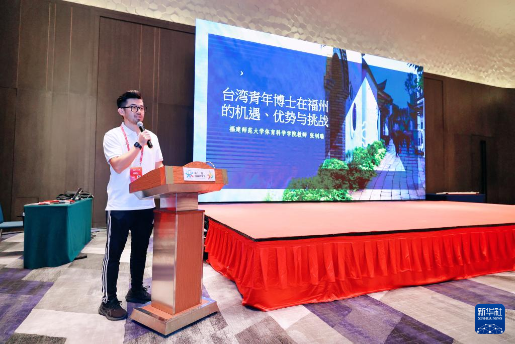 8月10日,福建师范大学体育科学学院台湾教师张钊瑞讲述“台湾青年博士在福州的机遇、优势与挑战”。新华社发(主办方供图)