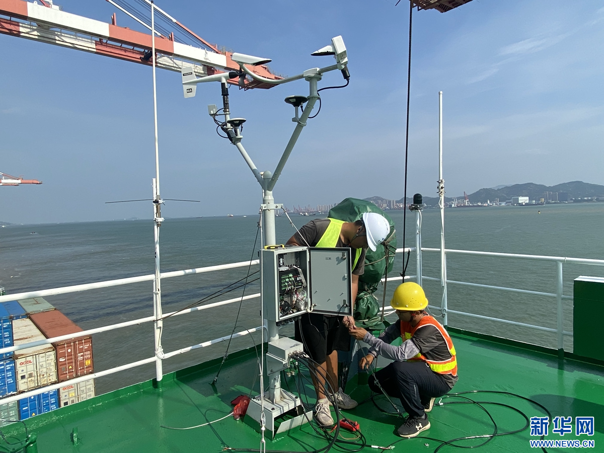 厦门市气象局工作人员在“拓远”轮上安装船舶气象观测站。 新华网发(林敏丹 摄)