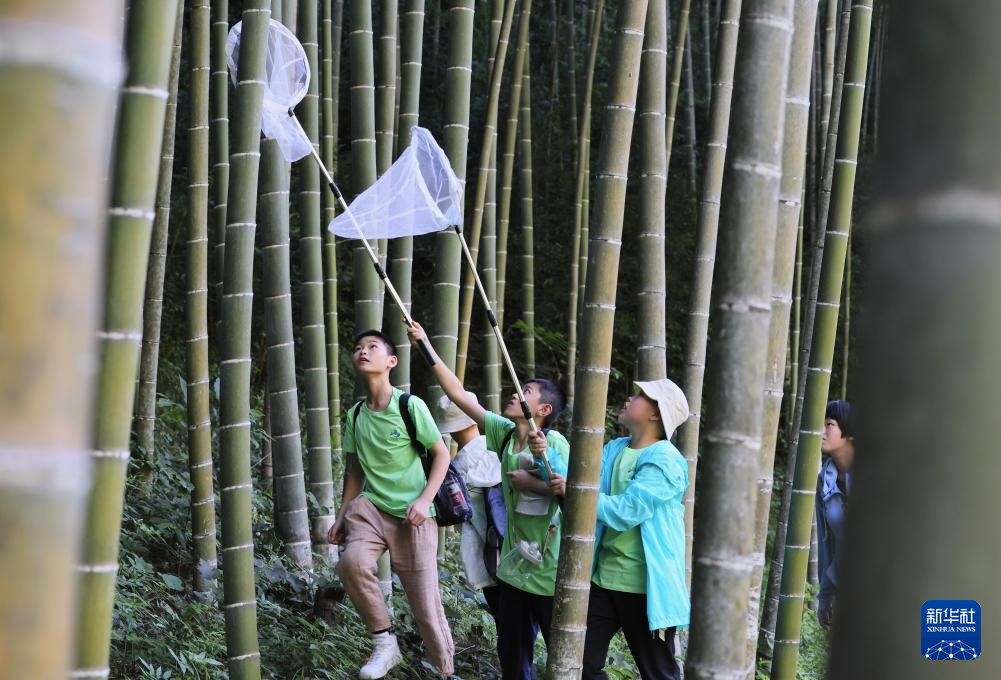 2022年7月23日,首届武夷山国家公园自然教育活动中,中小学生在武夷山国家公园大竹岚捕捉昆虫。新华社记者 姜克红 摄