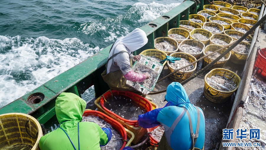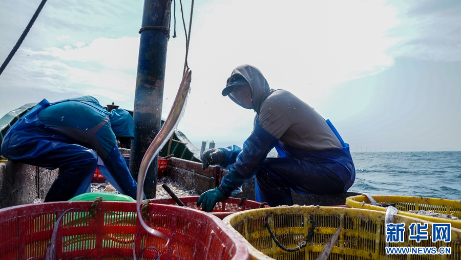 渔民挑拣出刚捞上来的带鱼。新华网 杨濛 摄