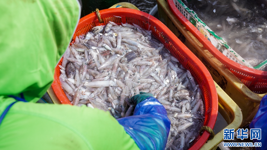 这网捕捞上来的主要是小鱿鱼,当地人称小管。红烧、白灼是当地人喜欢的烹饪方式。新华网 杨濛 摄