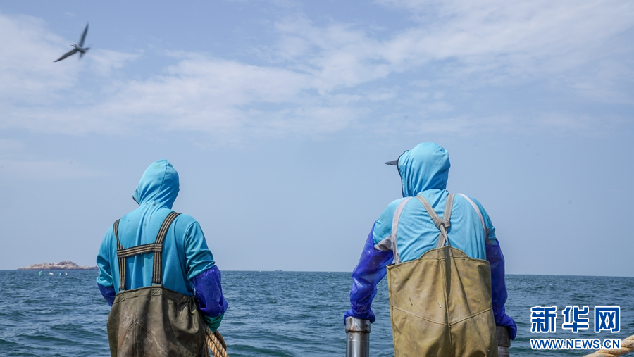 等候收网的渔民,与远处的海鸥形成一道别样风景线。新华网 杨濛 摄