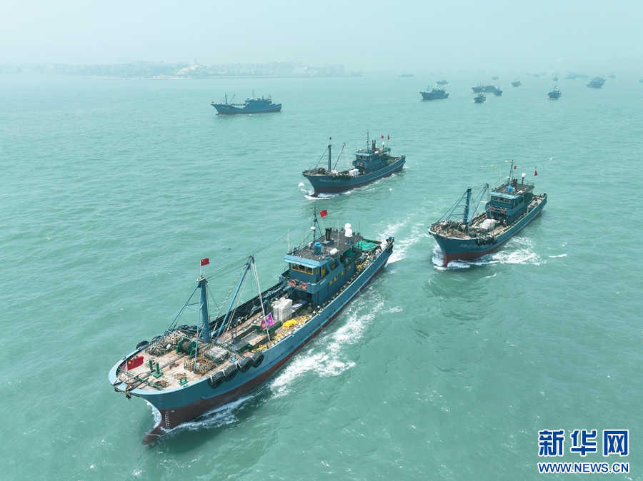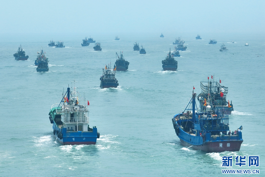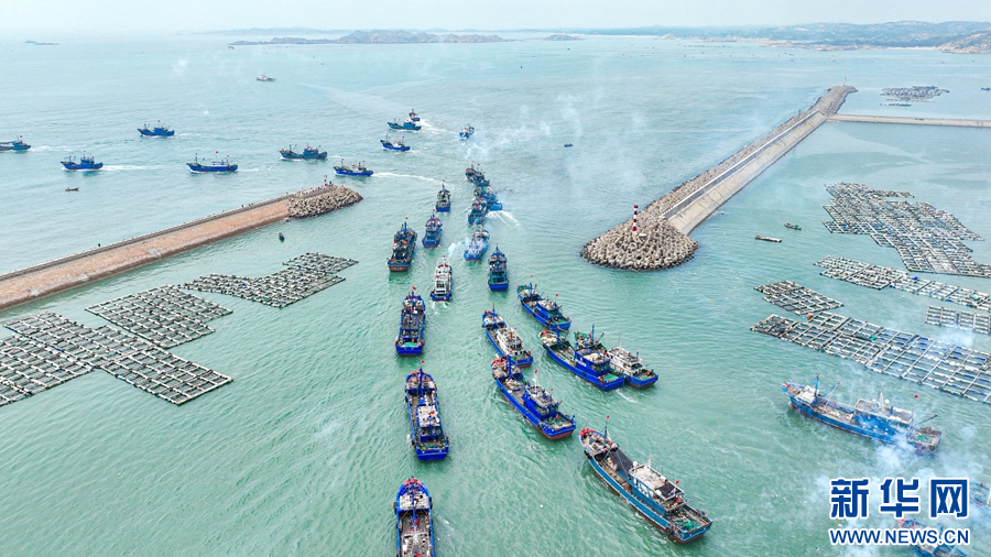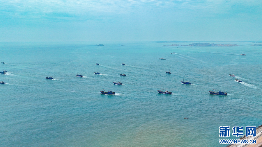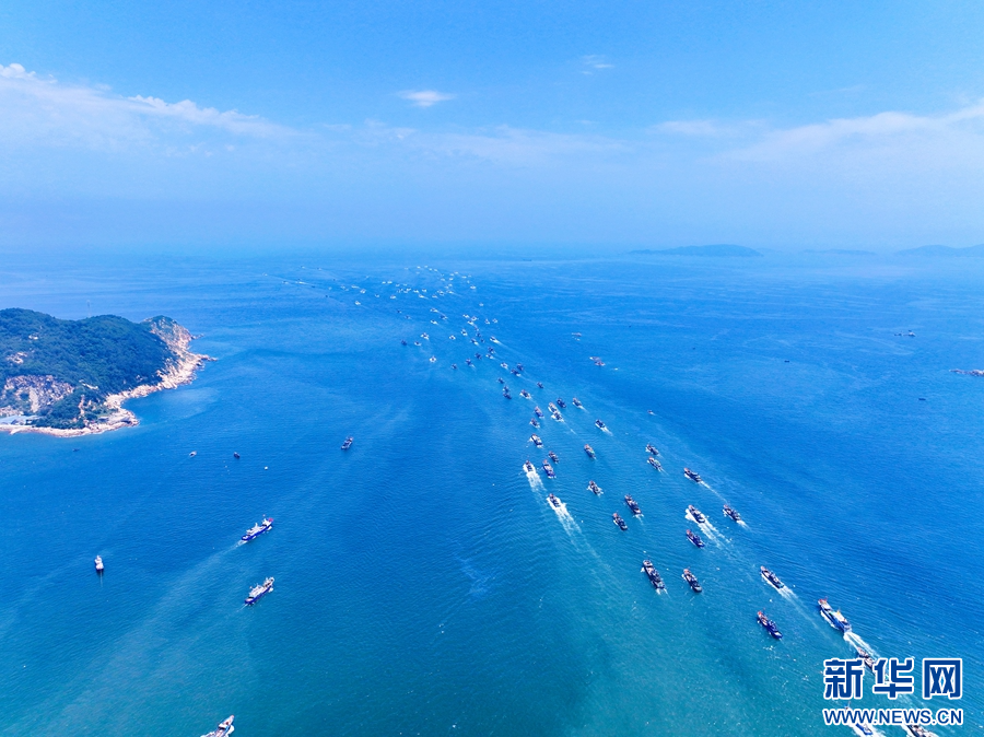 8月16日,在平潭澳前中心渔港,渔船井然有序驶离码头,开启第一轮捕捞作业。新华网发(江信恒 摄)