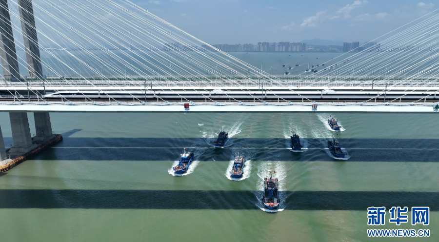 8月16日,渔船从福厦高铁泉州湾跨海大桥下驶过。新华网发(李响 摄)