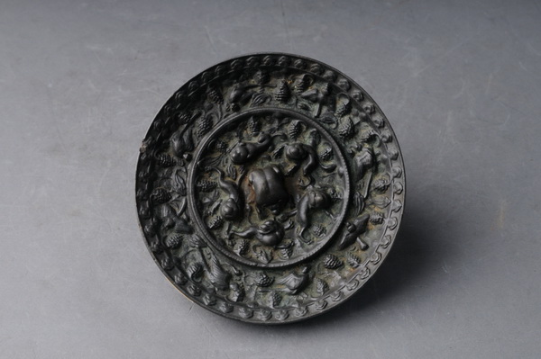 唐朝建立后,福建各行各业吸收了中原的先进技术,迅速发展成熟。唐代形成了以铜镜作为献礼和馈赠的社会风气,制镜业蓬勃发展。这件铜镜背面,来自异域的葡萄纹与中国纹样交织,是东西方文化交融的表现,故有“凝结欧亚大陆文明之镜”之誉。