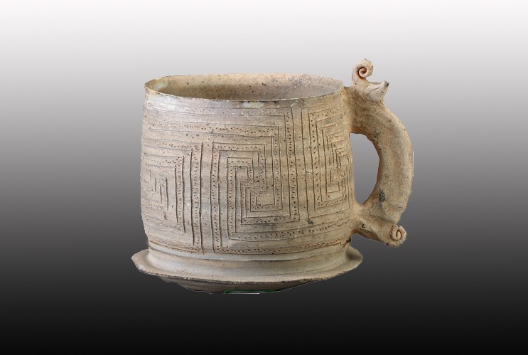 在距今3000年左右的西周时期,中原地区创造了鼎盛的青铜文明,福建远离中原,发展缓慢,陶器在先民生活中仍占据重要地位。这件福建黄土仑遗址出土的硬陶杯就是青铜时代的陶器,表现出强烈的仿铜作风。有学者认为黄土仑印纹硬陶器应是本地烧制的,代表了闽江下游一种受中原青铜文化影响的具有浓厚地方色彩的文化遗存。