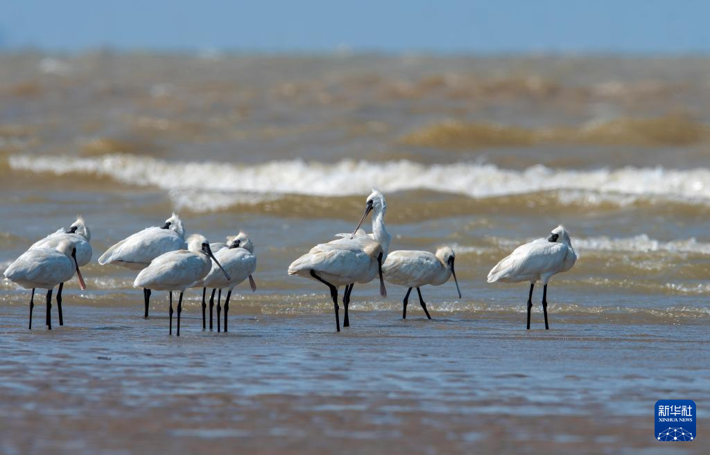 一群黑脸琵鹭在闽江河口湿地海滩上觅食(2023年5月9日摄)。新华社记者 魏培全 摄