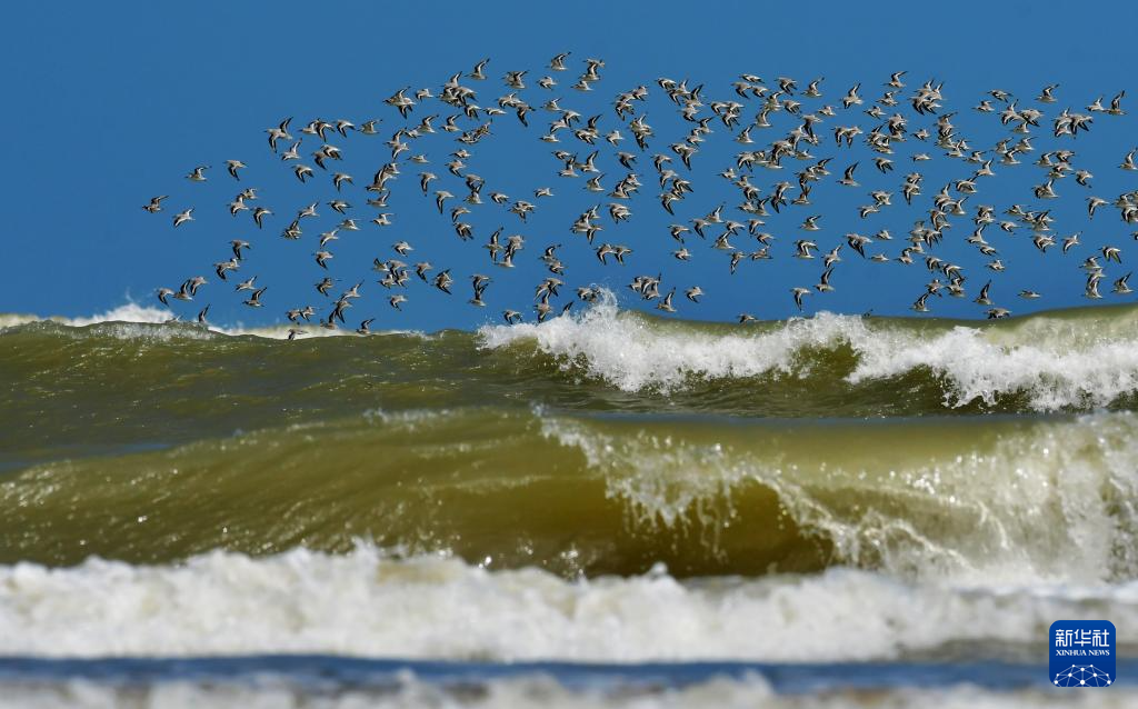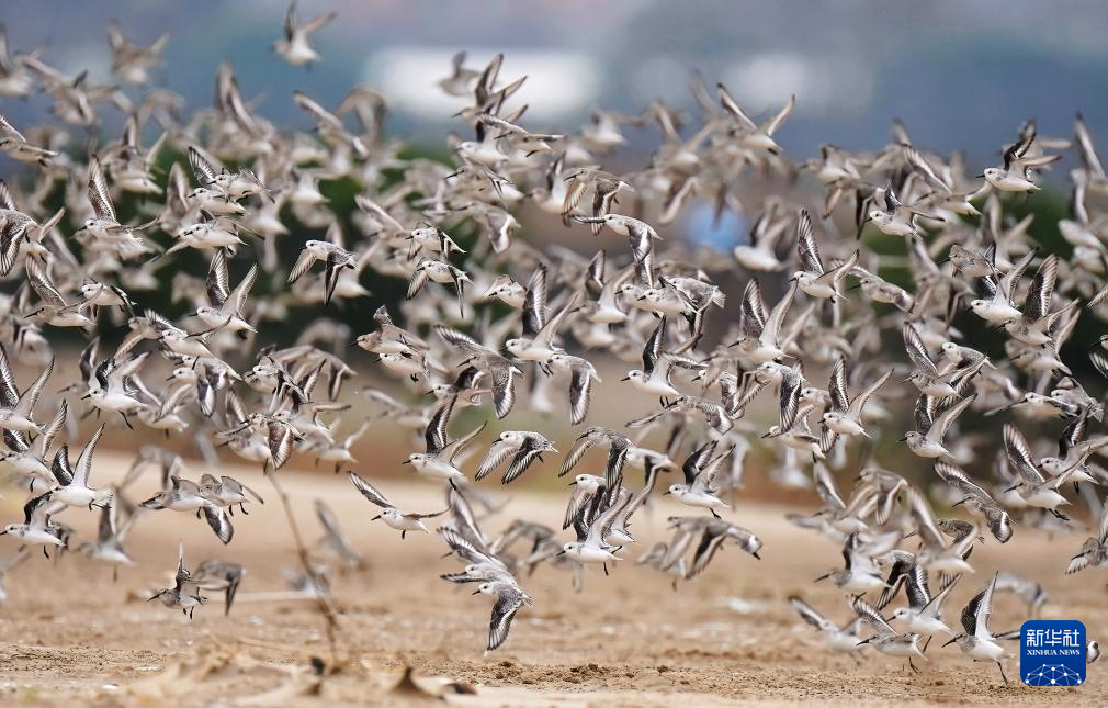 一群鸟飞越闽江河口湿地国家级自然保护区沙滩(2022年11月13日摄)。新华社记者 魏培全 摄