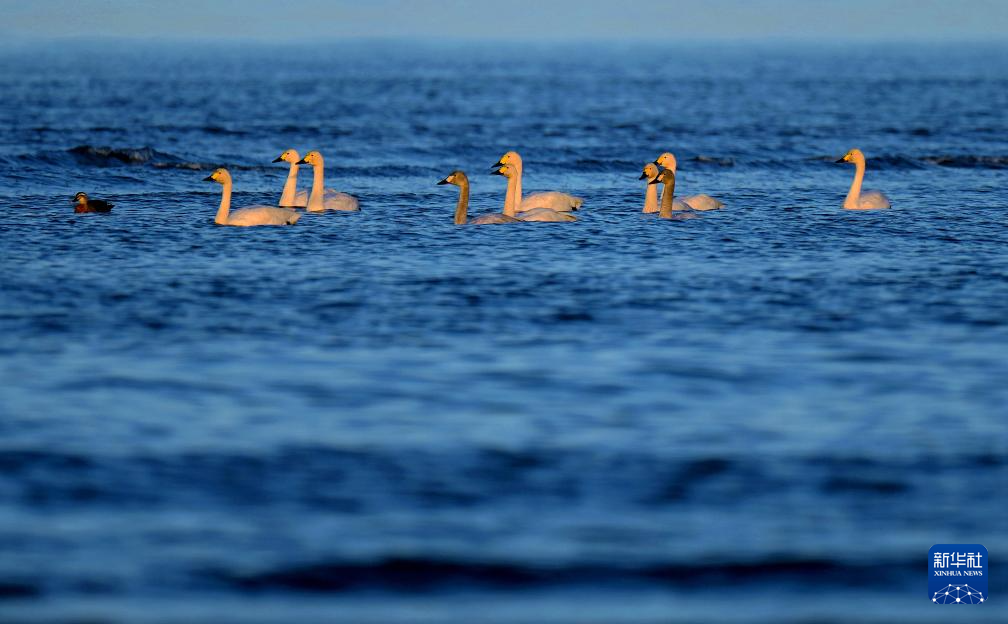 一群小天鹅在闽江河口湿地国家级自然保护区海面上觅食(2023年1月31日摄)。新华社记者 魏培全 摄