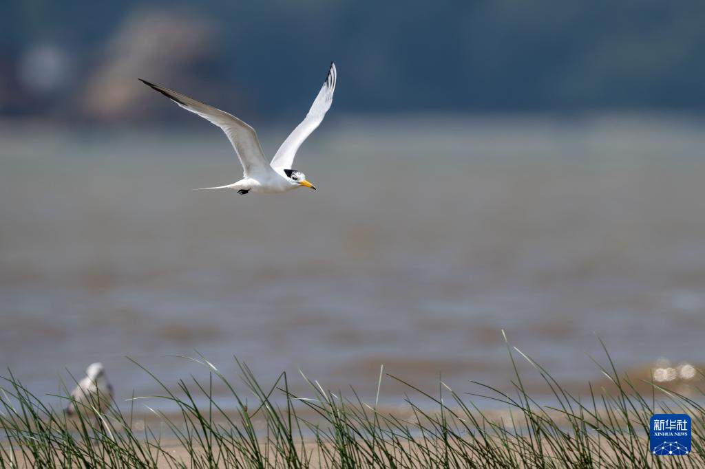 被誉为“神话之鸟”的中华凤头燕鸥掠过闽江河口湿地国家级自然保护区核心区沙滩(2023年6月25日摄)。新华社记者 魏培全 摄