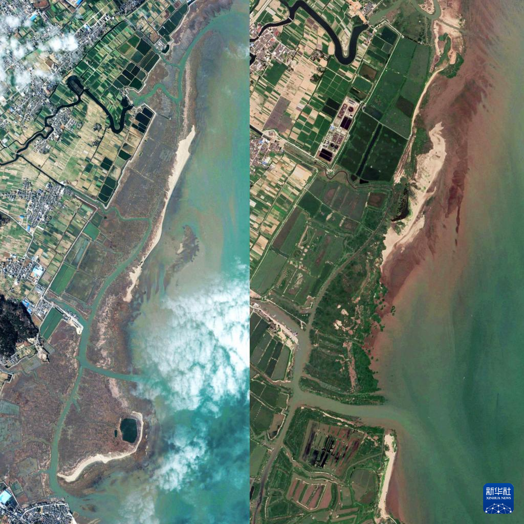 这是一张拼版照片:左图为2009年4月份的闽江河口湿地国家级自然保护区卫星图;右图为2020年6月份的闽江河口湿地国家级自然保护区卫星图。新华社发(闽江河口湿地国家级自然保护区供图)
