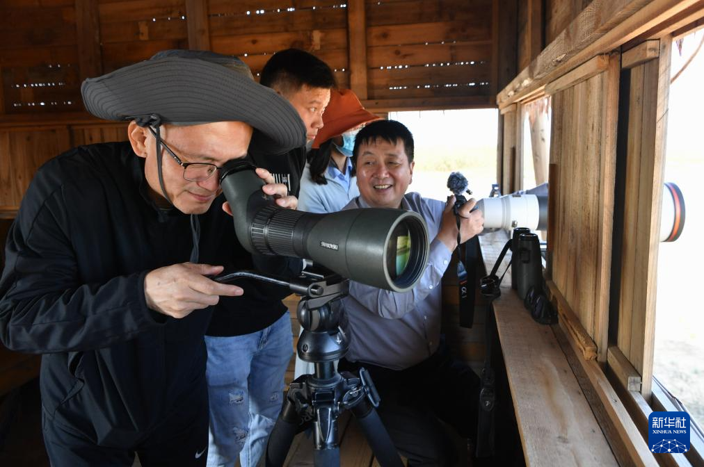 闽江河口湿地国家级自然保护区管理处主任郑航(右一)和同事在闽江河口湿地核心区域观鸟屋里,用望远镜和相机观测记录停留在湿地里的候鸟种类(2022年11月19日摄)。新华社记者 魏培全 摄
