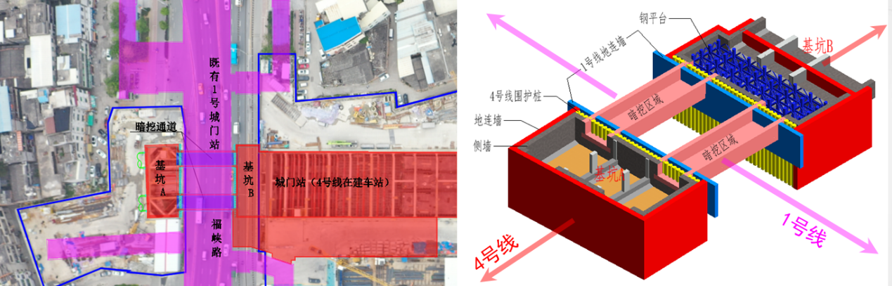 1号线为已运营车站,下穿段4号线结构顶板距1号线车站底板净距仅0.3米,是福建省内地铁最小净距下穿既有车站工程,也是福州地铁建设有史以来施工风险最大的车站工程之一。