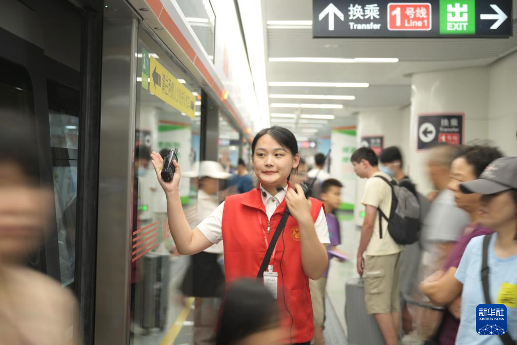 8月27日,工作人员在福州东街口站1号线与4号环线换乘处值班。