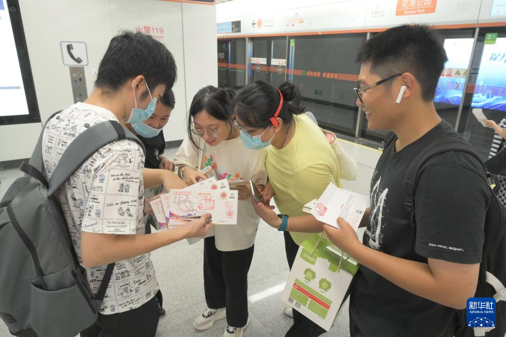 8月27日,乘客在地铁花海公园站翻看4号环线首通段载客运营首日封。新华社记者 林善传 摄