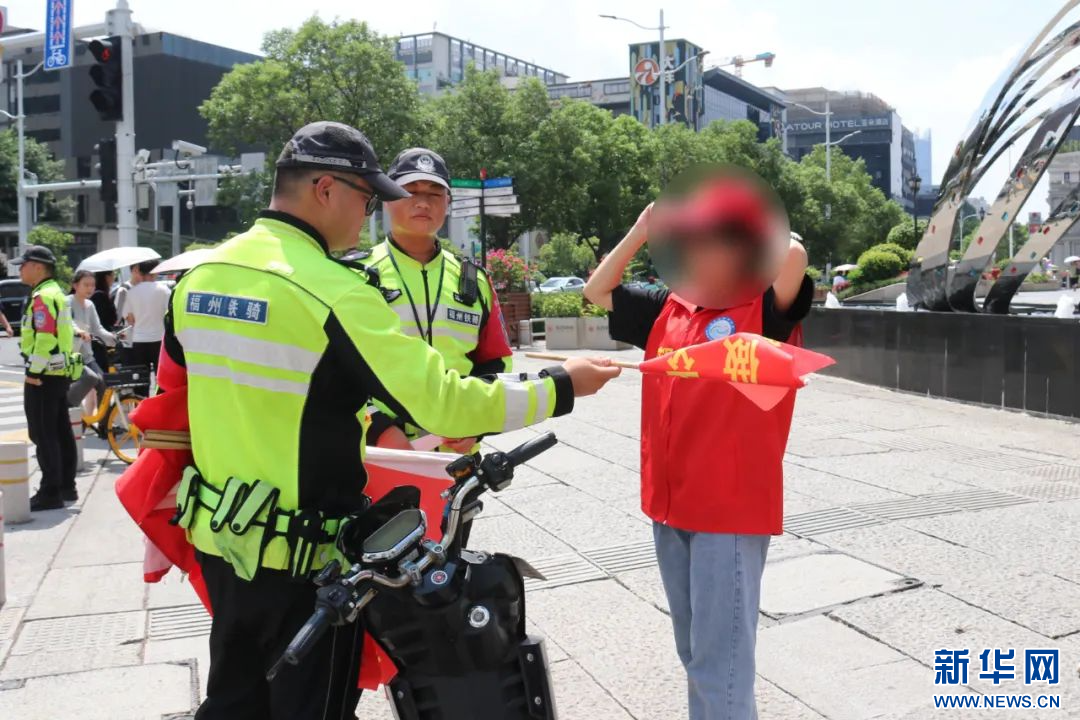 10时40分许,市民小洪在东街口骑电动车时未佩戴安全头盔,被民警拦下。经民警口头教育,小洪认识到了错误,随后穿戴红马甲、小红帽,在民警的带领下参与了街头执勤体验。