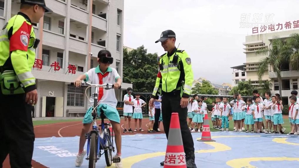 交警通过利用VR眼镜体验酒驾感觉、登上大车驾驶室感受车辆盲区等活动,提高同学们的安全意识。