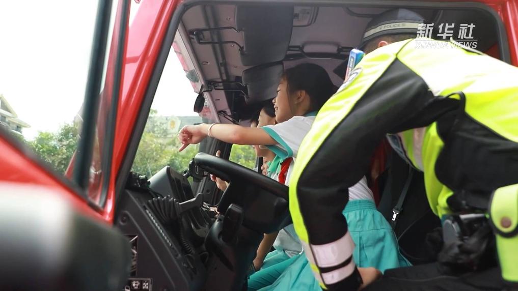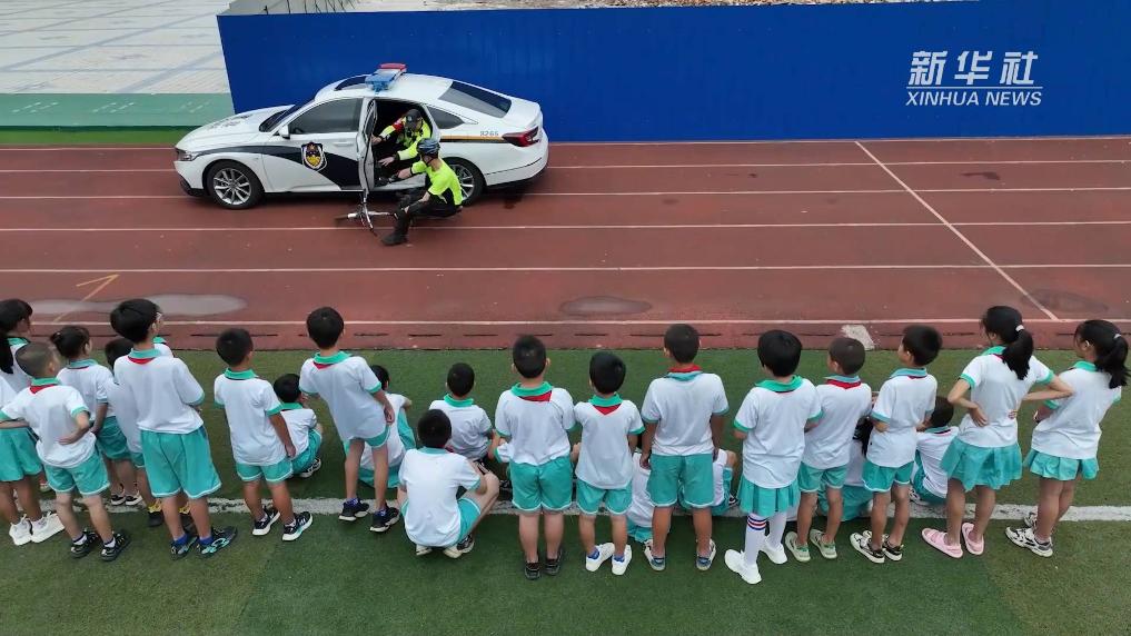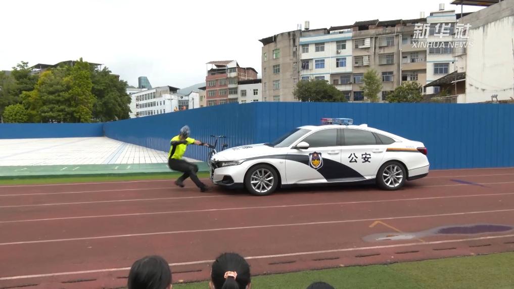 在操场上,交警们实地模拟“鬼探头”“开门杀”等危险场景让孩子们对生活中的类似情形提高警惕。