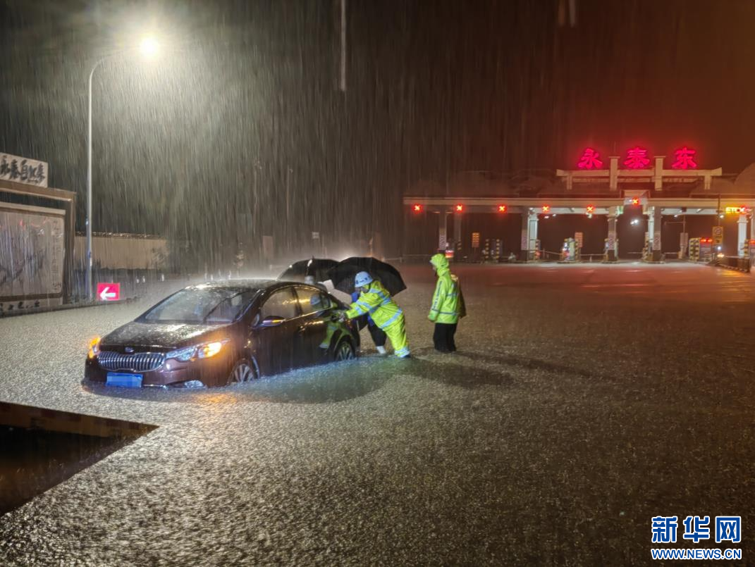 9月4日晚,永泰公安民警在高速口帮助转移积水中受困车辆。新华网发(福建省公安厅供图)