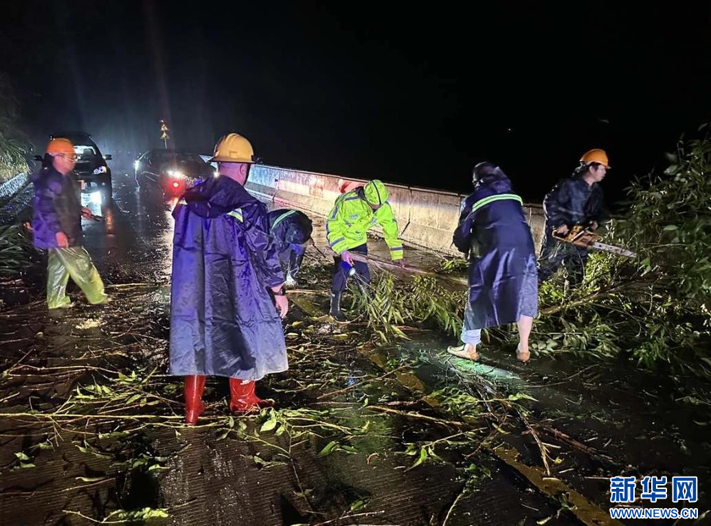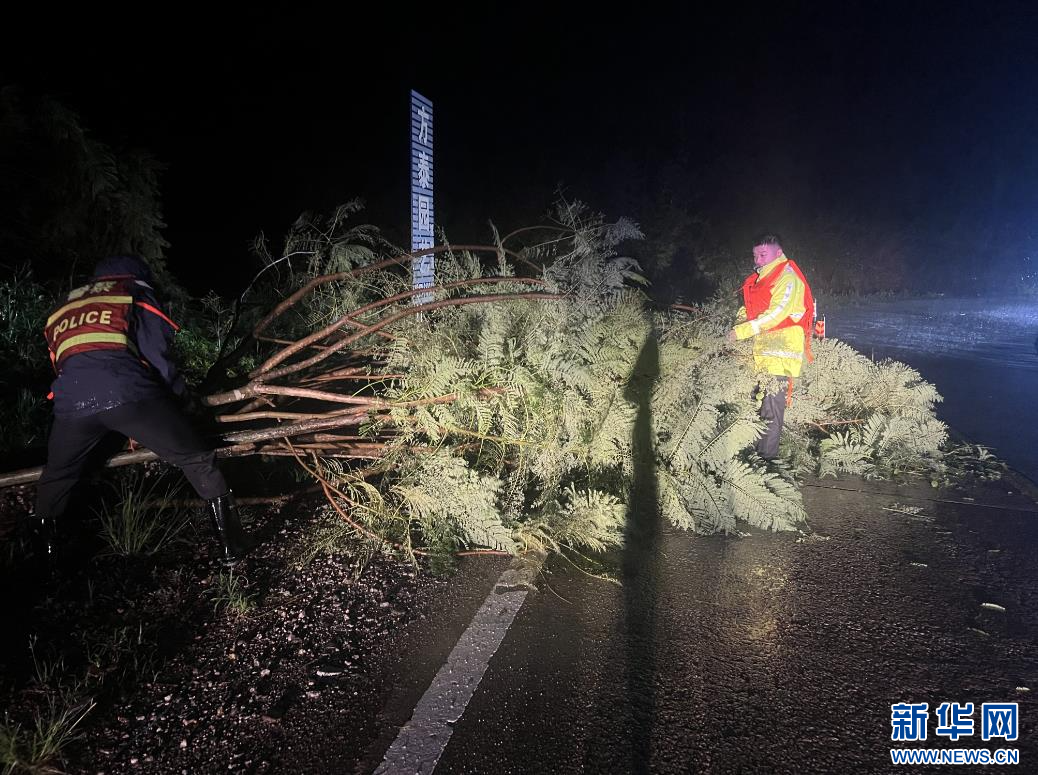 9月4日晚上,漳浦县赤岭派出所民警在赤岭畲族乡五棵松路段沿线,清除倒伏林木,进行交通疏导。新华网发(福建省公安厅供图)