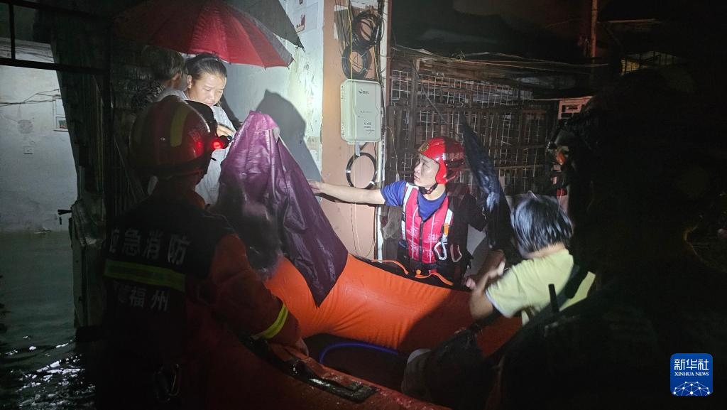 9月6日,在福州市台江区斗池路凤凰新村,消防救援人员利用橡皮艇转移被困群众。新华社发
