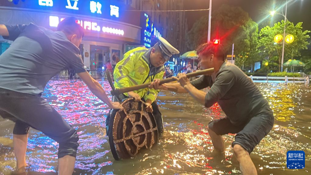 9月5日晚,因路面积水严重,福州市连江县公安局民警与群众抬起井盖,疏通下水道。新华社发