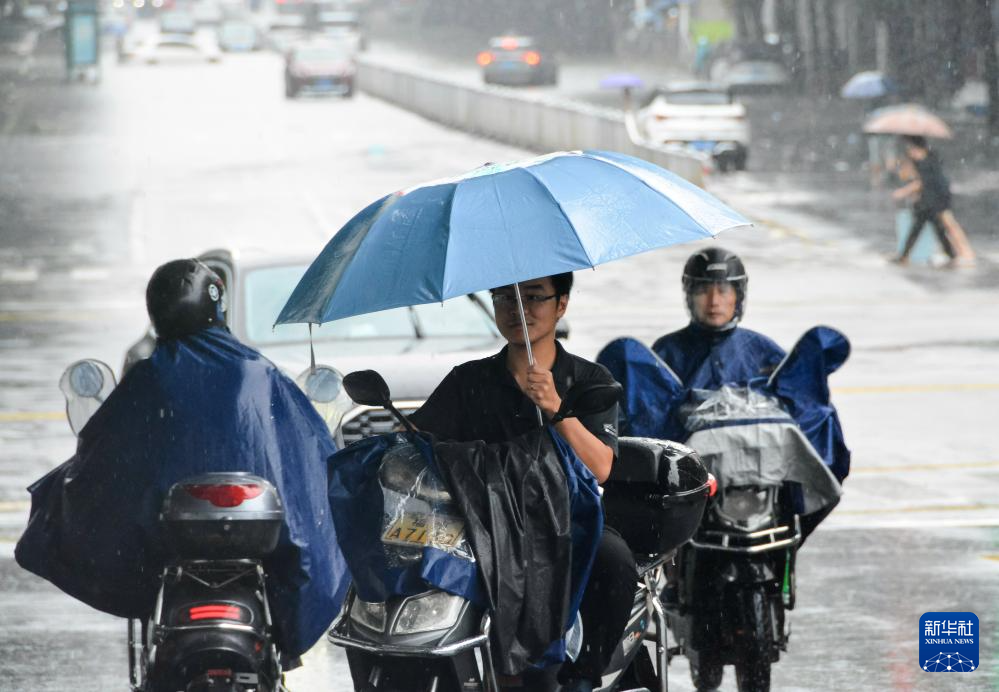 9月6日,在福州市晋安区福新路和六一路交叉口,市民冒雨出行。新华社记者 魏培全 摄