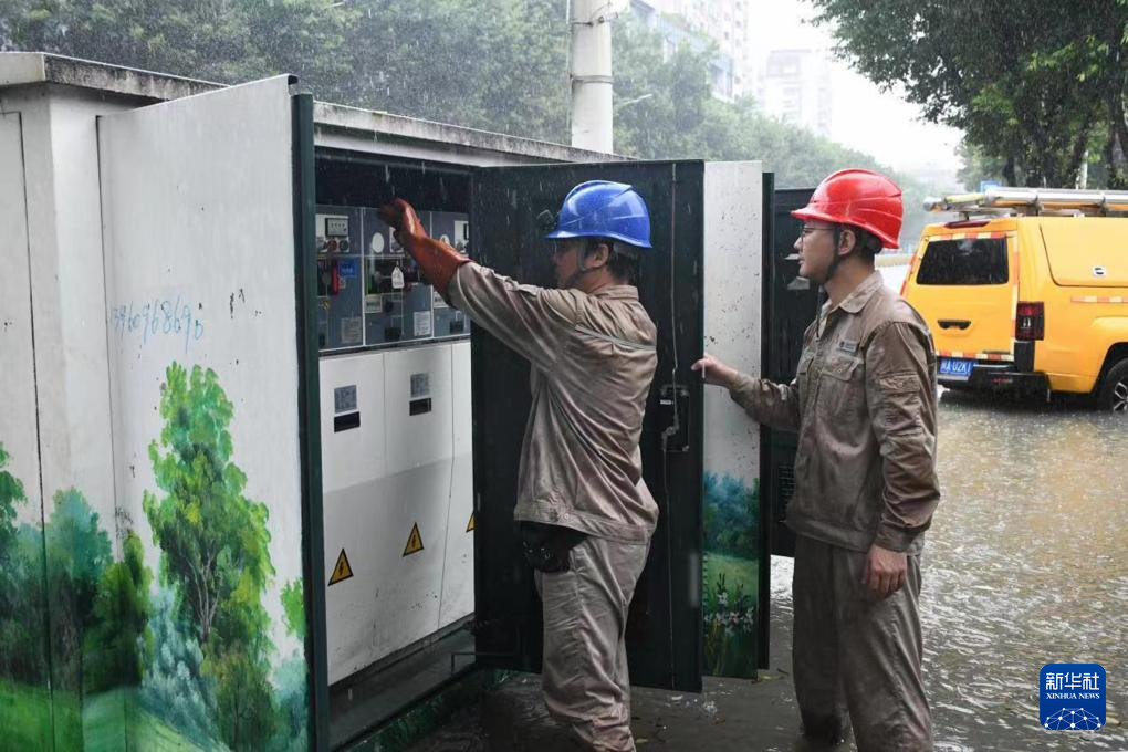 9月6日,福州电力工人站在积水中检修设备。新华社发