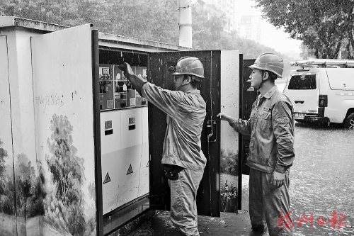 6日,电力工人在国货路对被淹的环网柜进行隔离操作。陈德钧 摄