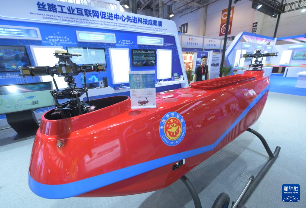 9月8日拍摄的在中国—中亚国家合作展区展出的纵列式双旋翼无人直升机。新华社记者 林善传 摄
