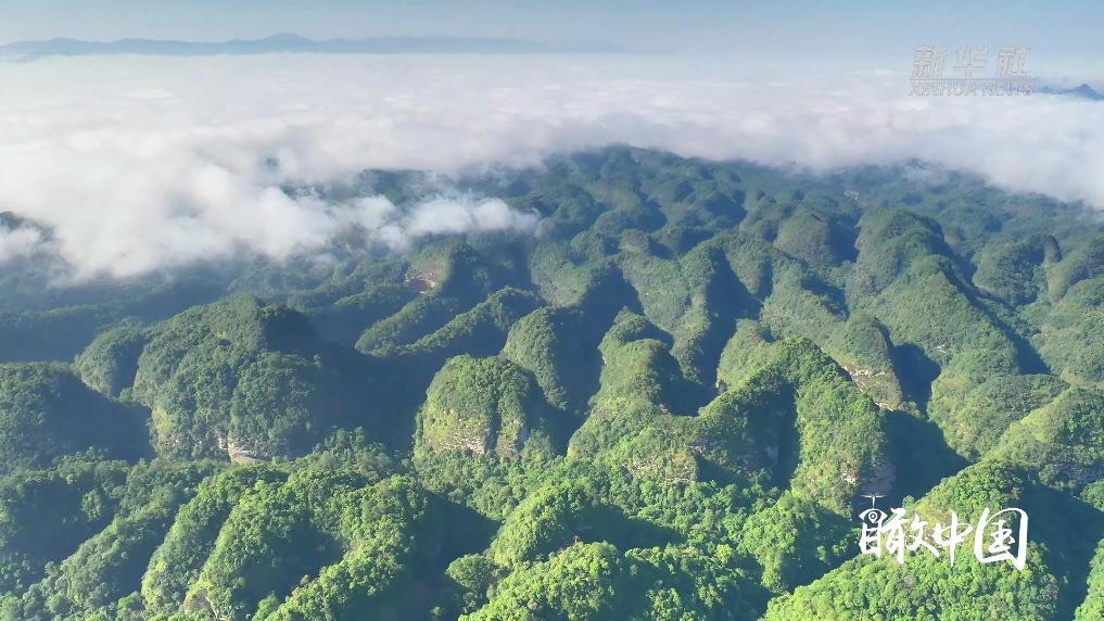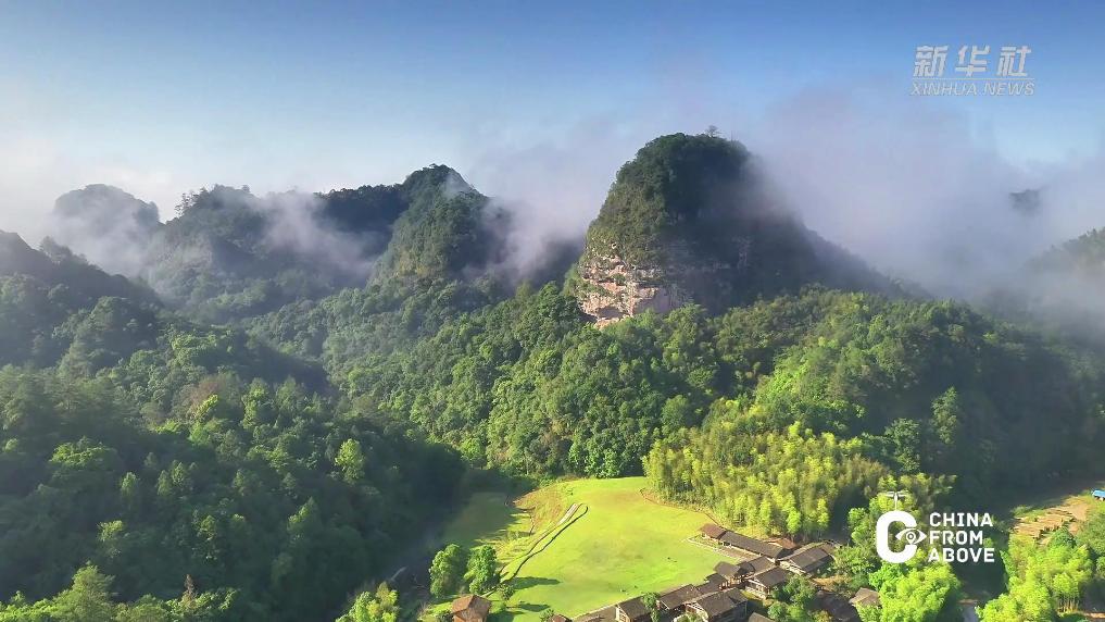 丹山翠岭之间,轻柔的云雾缭绕,曙光在云雾上弥漫,满眼是云蒸霞蔚的梦幻世界,宛若仙人之居。
