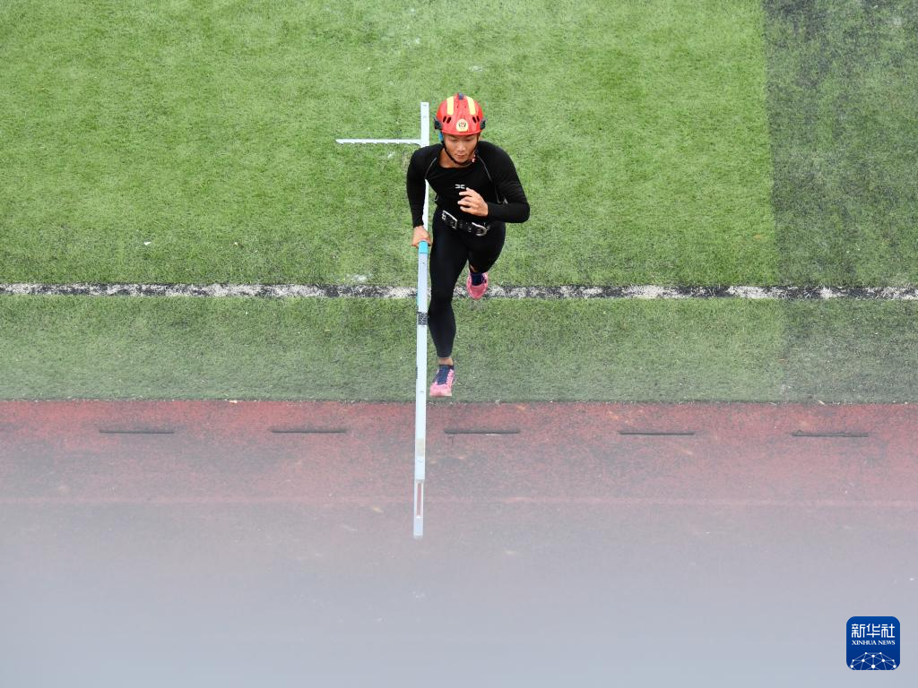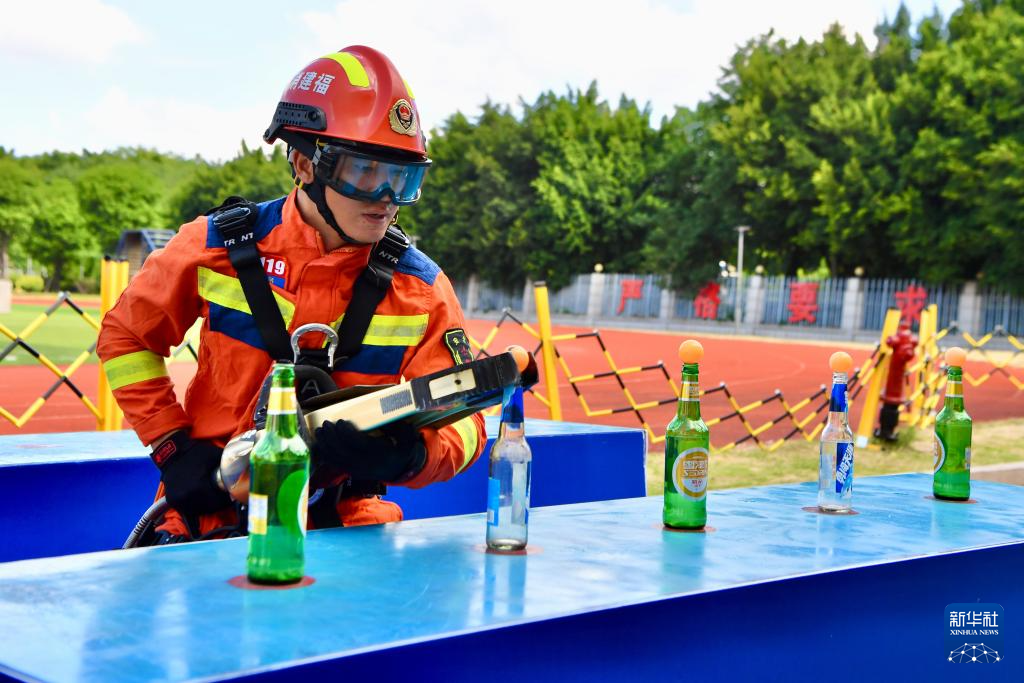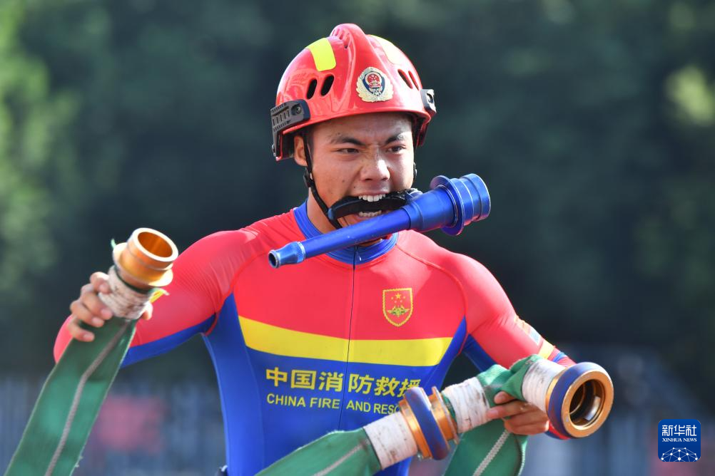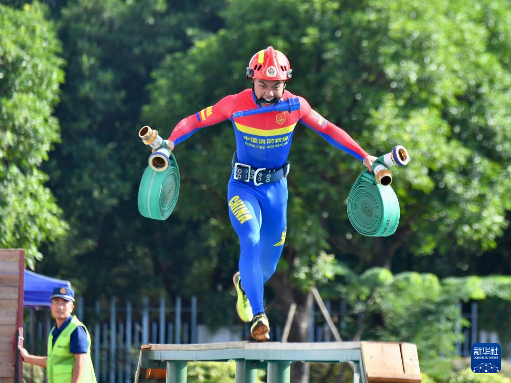 9月26日,参赛选手在进行100米消防障碍比赛。新华社记者姜克红摄