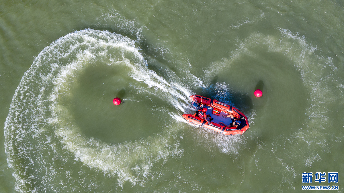 9月25日,水域救援项目竞赛中,消防员驾驶救援艇在浮球之间绕行(无人机照片)。新华网 肖和勇 摄