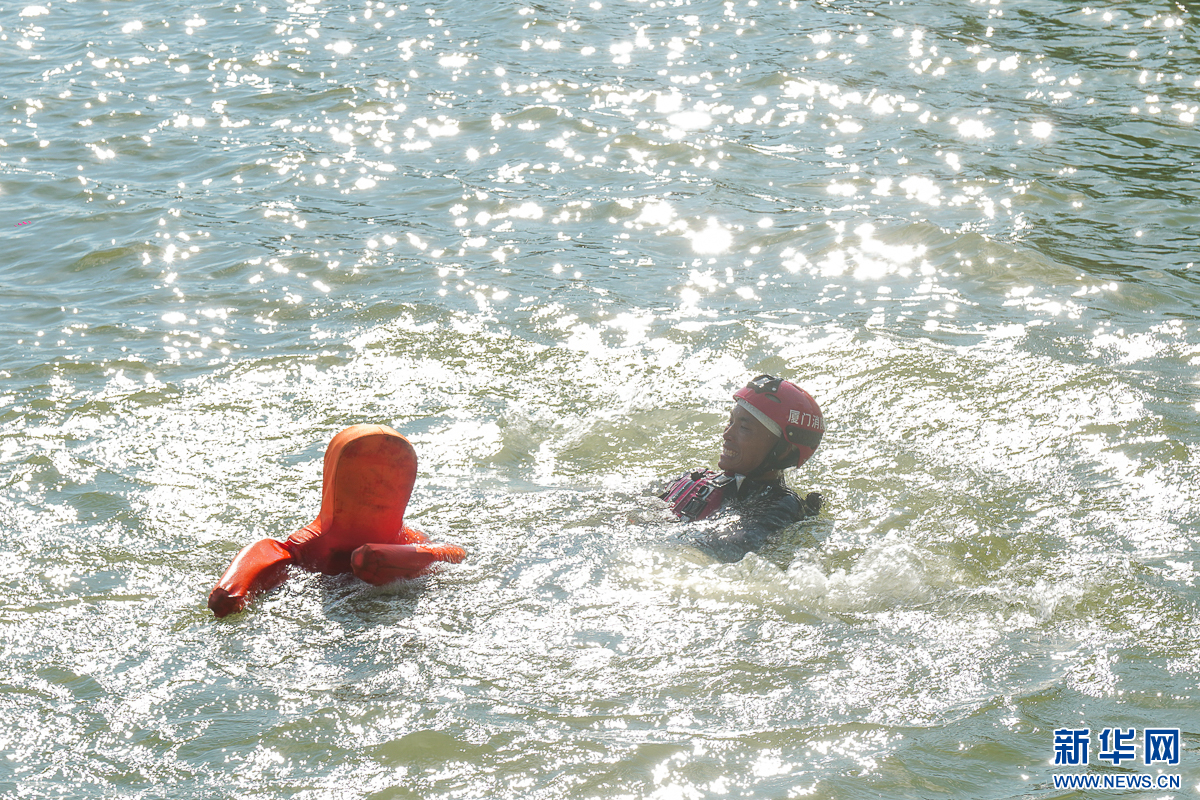 9月25日,水域救援项目竞赛中,消防员将假人带上岸。新华网 肖和勇 摄