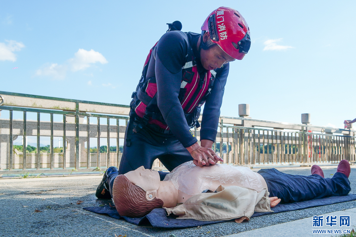 9月25日,水域救援项目竞赛中,消防员对假人进行急救操作。新华网 肖和勇 摄