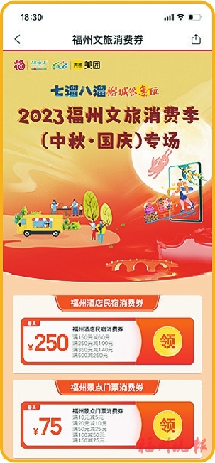 记者从福州市文化和旅游局获悉,“七溜八溜 榕城很惠玩”——2023福州文旅消费季(中秋·国庆)专场,将于9月28日下午在上下杭历史文化街区启动。28日至30日,福州将发放3轮总价值超500万元的文旅消费券,邀请市民游客超“惠”游福州,全面激活消费“主引擎”。