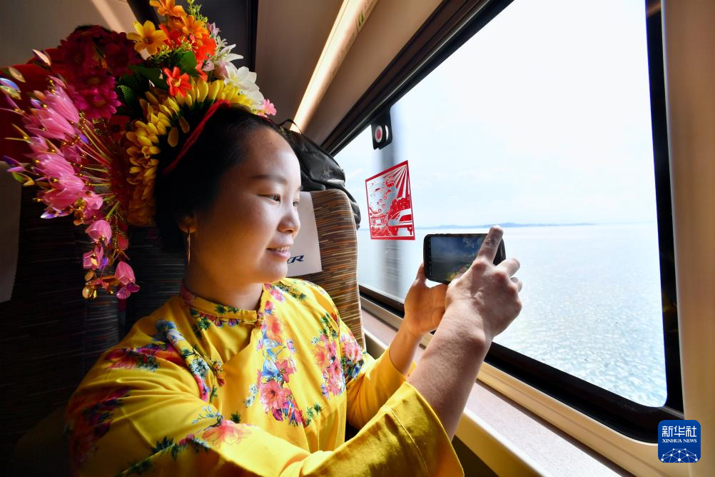 9月28日,在福厦高铁首趟复兴号智能动车组G9801次列车上,泉州蟳埔女黄丽泳用手机拍摄窗外景色。新华社记者 姜克红 摄