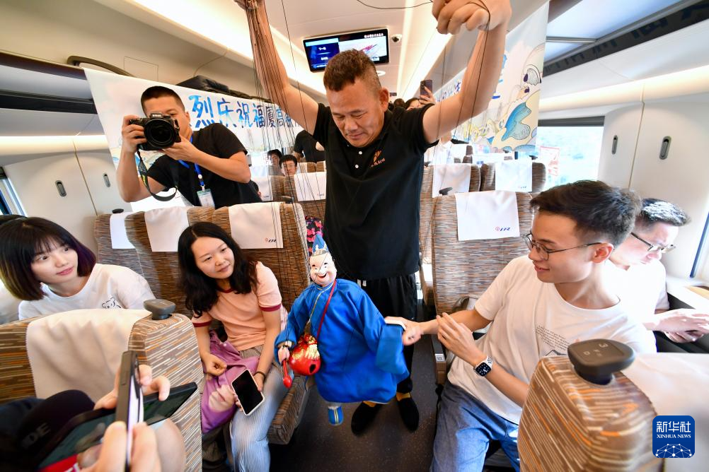 9月28日,在福厦高铁首趟复兴号智能动车组G9801次列车上,木偶表演者在为乘客表演提线木偶。新华社记者 姜克红 摄