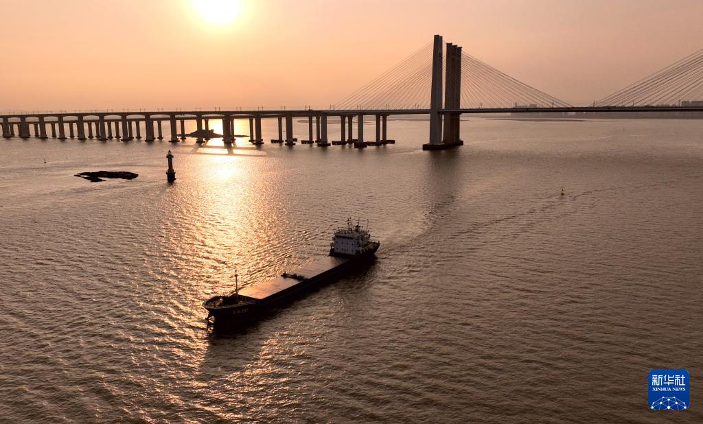 一艘货轮缓缓穿过福厦高铁泉州湾跨海大桥(9月18日摄,无人机照片)。新华社记者 魏培全 摄