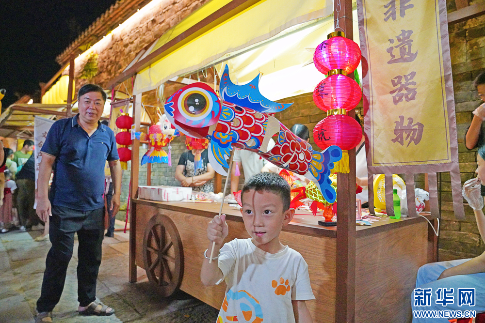9月29日晚上,小朋友在集市上展示当地特色非遗物品。新华网发(泰宁县委宣传部供图)