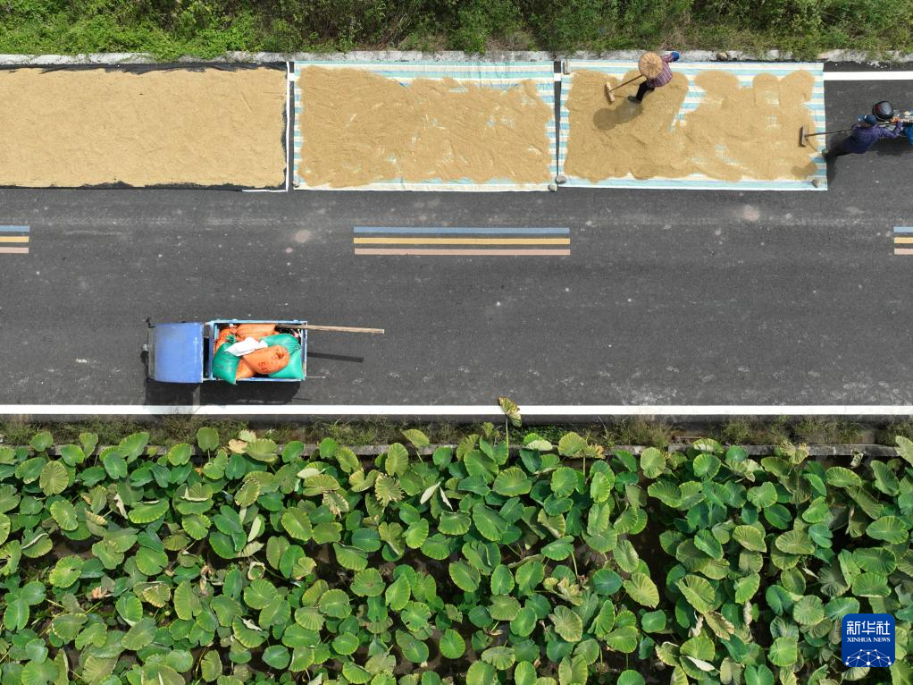 10月2日,福建省永泰县白云乡村民在晾晒刚收获的水稻(无人机照片)。新华社记者 姜克红 摄