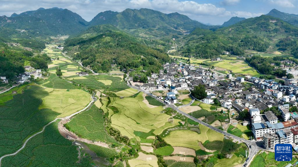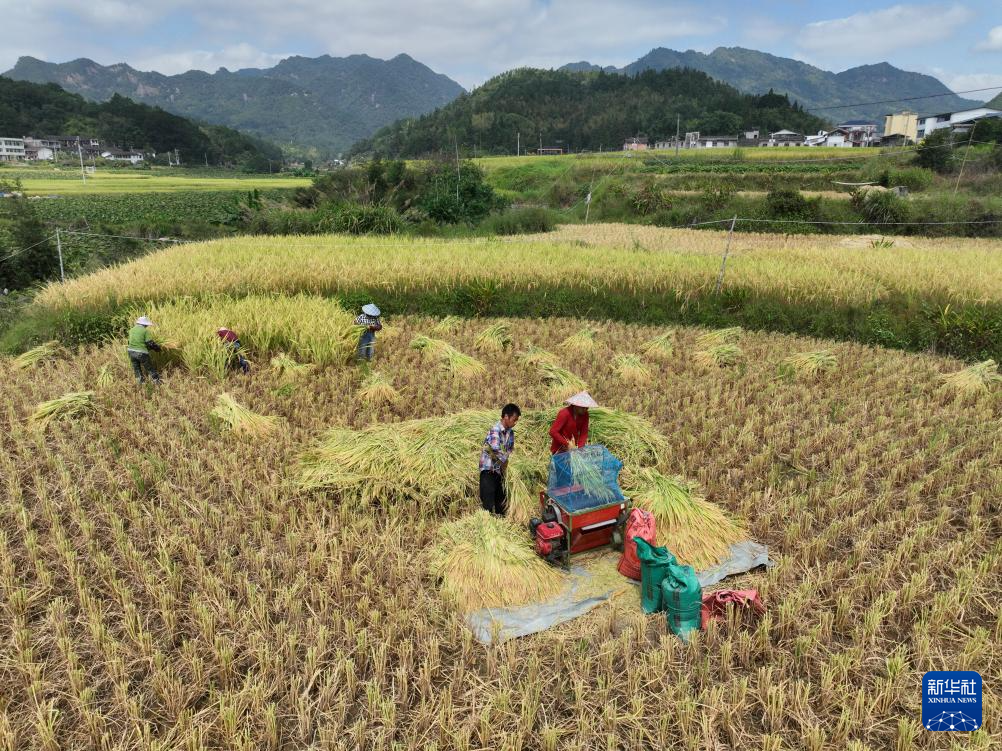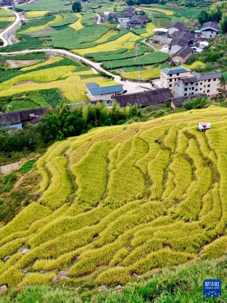 中秋前后,福建省永泰县10多万亩水稻进入成熟收获期,一块块金黄色的稻田点缀在青山与传统村落之间,田间地头一派繁忙的秋收景象。