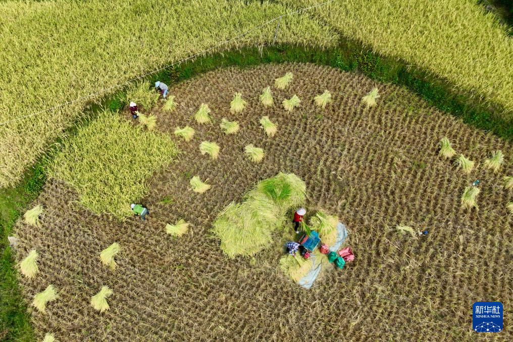 10月2日,福建省永泰县白云乡村民在收获水稻(无人机照片)。新华社记者 姜克红 摄