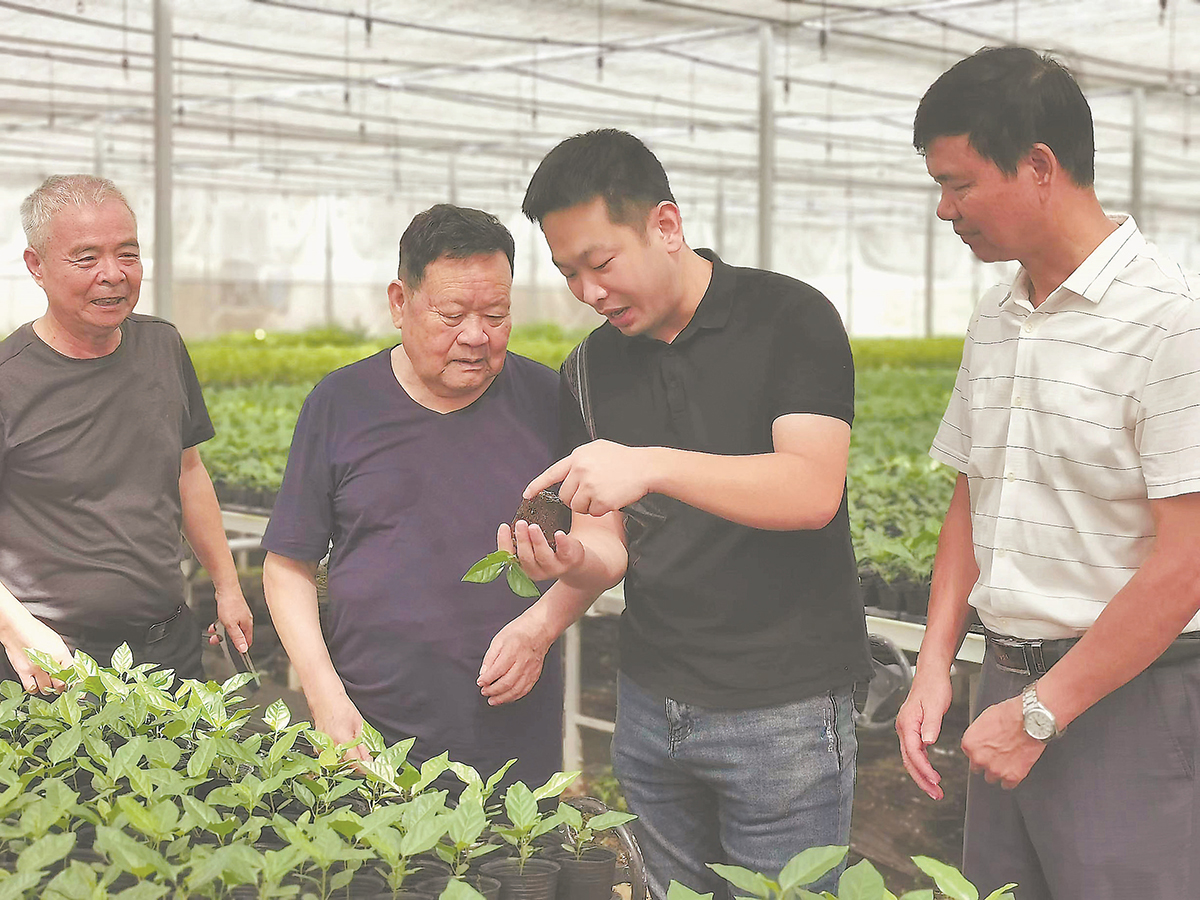 “新农人”许巡嵘(右二)为农户讲解百香果苗栽培技巧。