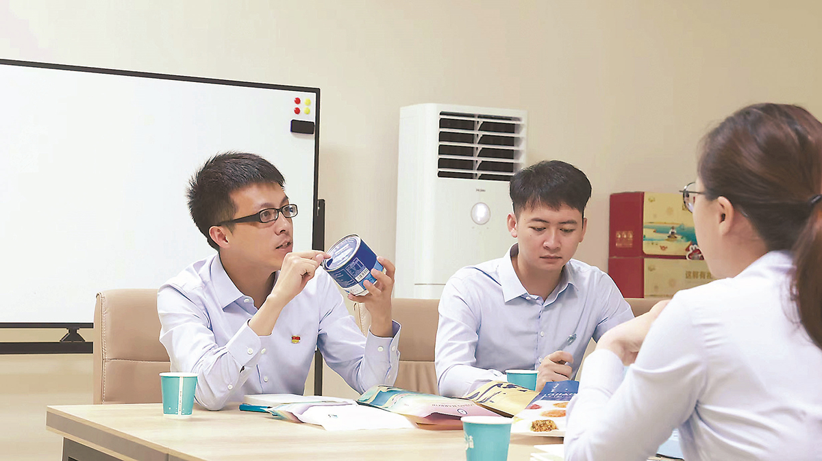 “新农人”许玉冰(左一)与创业伙伴探讨蟹肉罐头卖点。