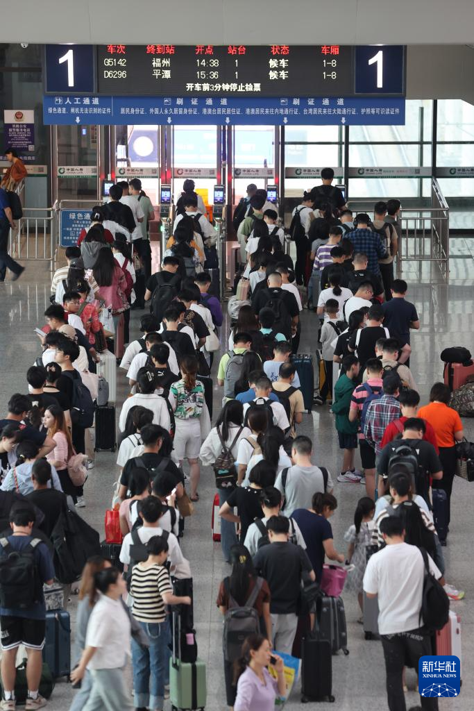 10月6日,旅客在福建厦门火车站候车大厅排队等候上车。新华社发(曾德猛 摄)