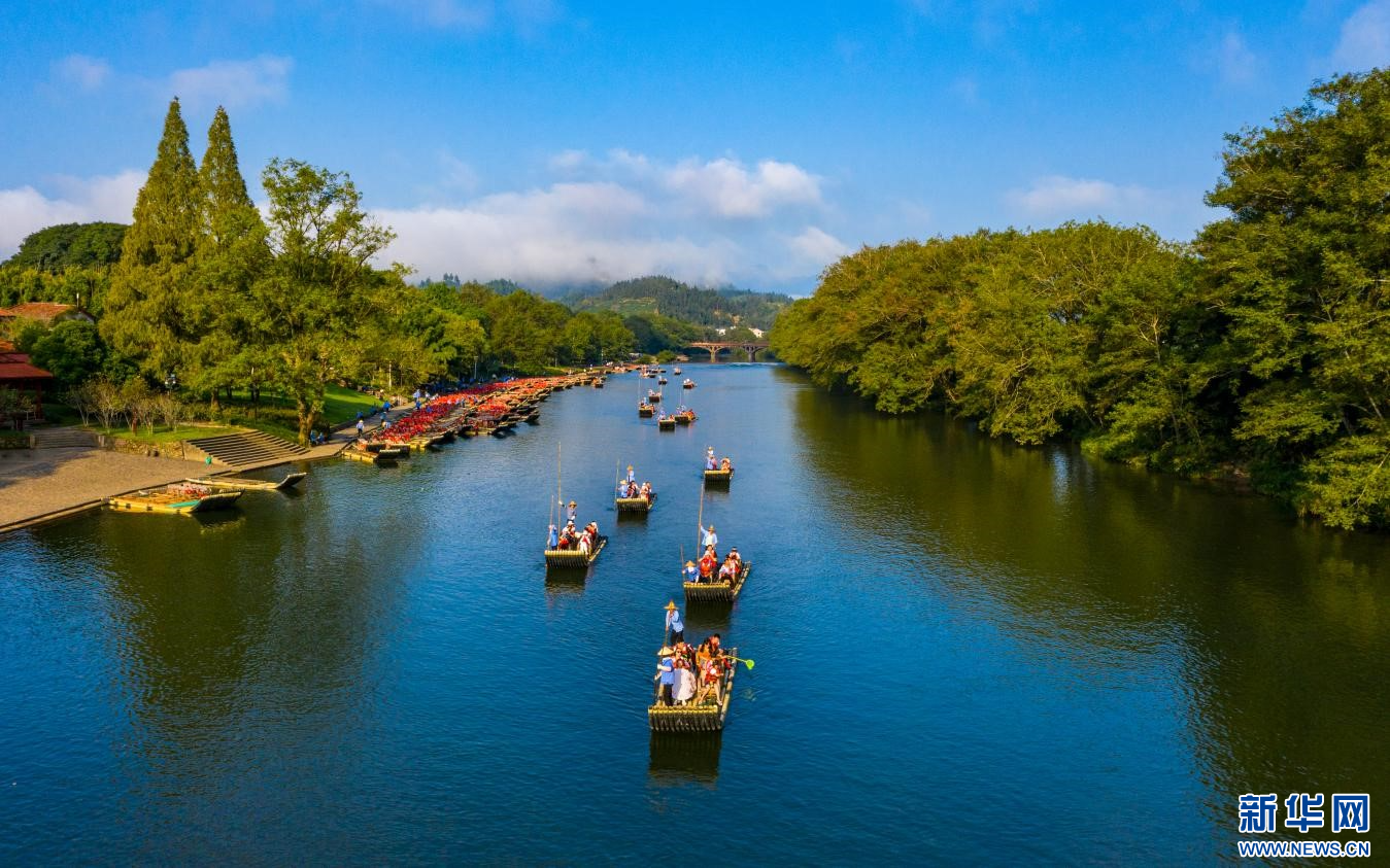 游客乘坐竹筏游览九曲溪。新华网发(彭善安 摄)